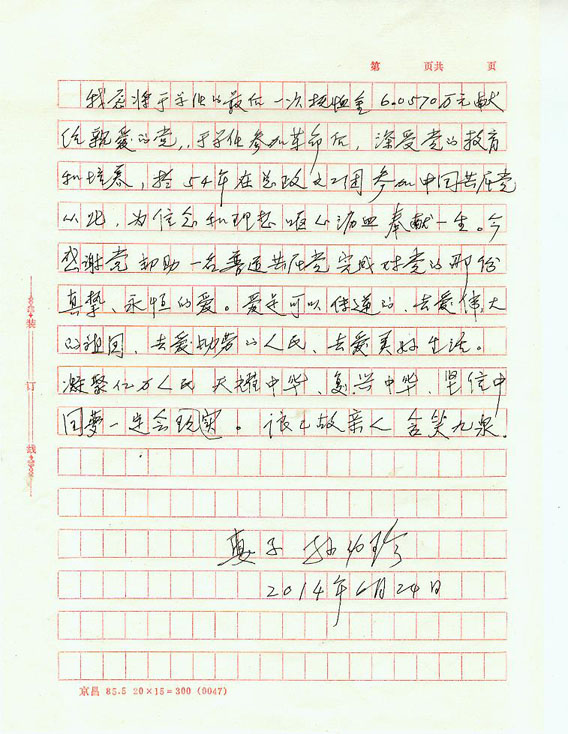 “我老伴能夠陪我這么長(cháng)時(shí)間,都是因為黨的關(guān)懷和出版社的幫助?!贝藭r(shí)此刻,孫幼珍老人對黨的感激,對出版社的感謝化作眼角的淚光閃爍。在出版社李鋒 書(shū)記、來(lái)豫蓉副書(shū)記面前,她從黃色的破布口袋里掏出一個(gè)塑料口袋,里面整齊的裝著(zhù)六萬(wàn)零五百七十元人民幣,這是科學(xué)出版社在于學(xué)任離世后一次性發(fā)放的撫恤 金,孫幼珍親自到銀行如數取出,還叮囑銀行工作人員盡量要嶄新的人民幣,她不想麻煩出版社,拒絕單位派車(chē)接送,為了不引人注意她用破布口袋裝錢(qián),遵照于學(xué) 任生前的愿望,將這份沉甸甸的深情交到書(shū)記手中。一直保持微笑的她聲音突然哽咽的說(shuō):“錢(qián)很少,但是表達了我們對黨的愛(ài),他再也不能為黨做些什么了,這是 他最后的心意,感謝你們幫助他完成最后的心愿?!迸c黨費一起交到書(shū)記手中的,還有孫幼珍老人親筆書(shū)寫(xiě)的一封信,她的視力已經(jīng)很微弱,在放大鏡的幫助下寫(xiě)了 這樣一段慷慨激昂的話(huà):“我愿將于學(xué)任的最后一次撫恤金6.0570萬(wàn)元獻給親愛(ài)的黨,于學(xué)任參加革命后,深受黨的教育和培養,于54年在總政文工團參加 中國共產(chǎn)黨,從此,為信念和理想嘔心瀝血奉獻一生。今天感謝黨幫助一名普通共產(chǎn)黨(員)完成對黨的那份真摯、永恒的愛(ài)。愛(ài)是可以傳遞的,去愛(ài)偉大的祖國, 去愛(ài)勤勞的人民,去愛(ài)美好生活。凝聚億萬(wàn)人民,天耀中華,復興中華,堅信中國夢(mèng)一定會(huì )實(shí)現,望已故親人含笑九泉?!?/p>